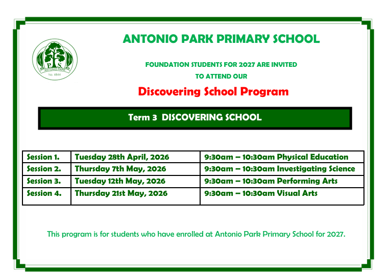 You will be able to apply to enrol your child in Foundation (Prep) 2027 at Antonio Park Primary School from 20 April 2026. Families are asked to submit enrolment applications by Friday 31 July 2026.